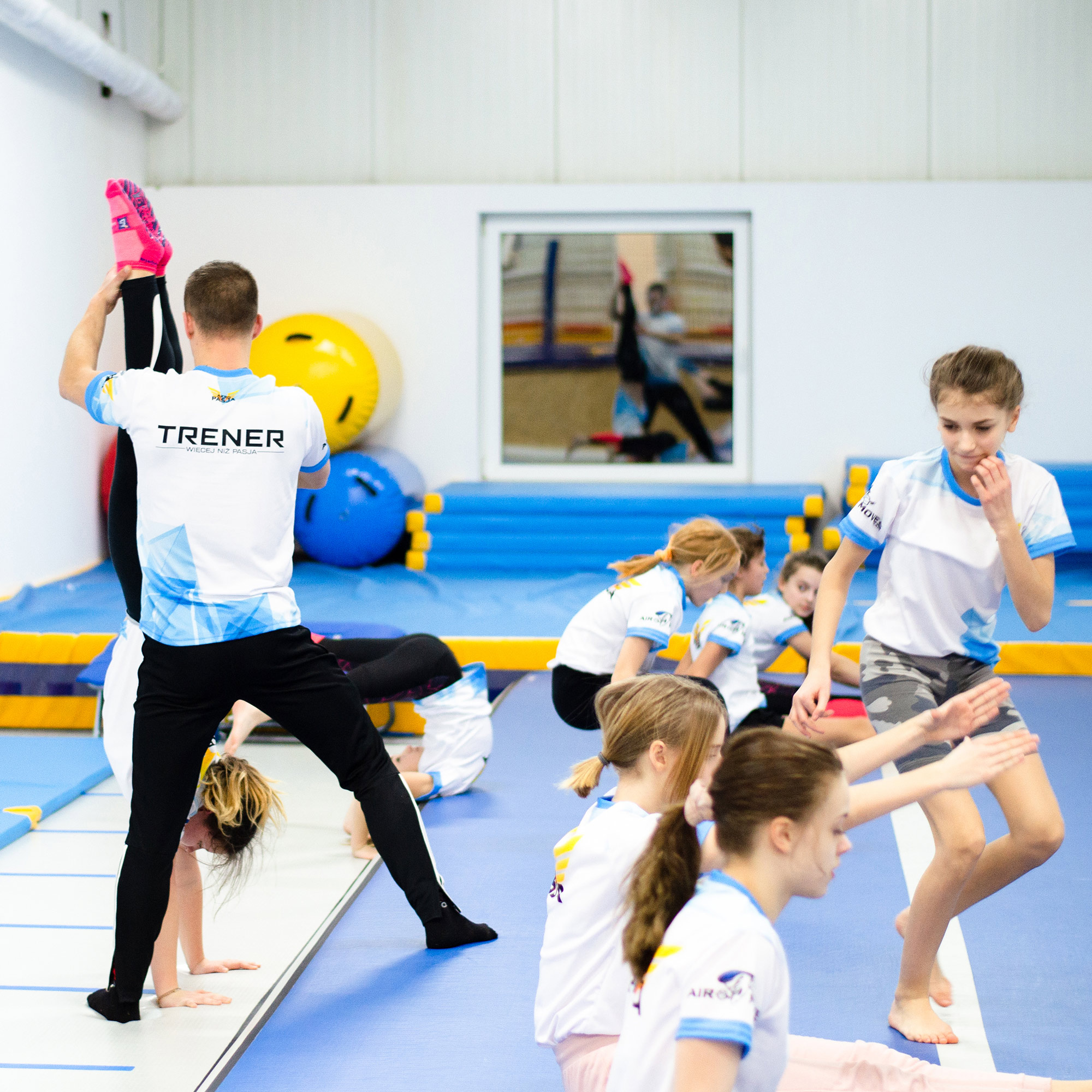 Prowadzimy treningi grupowe z zakresu akrobatyki, gimnastyki dla dzieci od 7 roku życia. Zajęcia odbywają się 2 razy w tygodniu dla każdej z grup. Przynależność do grupy klasyfikuje poziom umiejętności, a nie wiek uczestnika. W naszej sekcji wyróżniamy następujące poziomy grup: