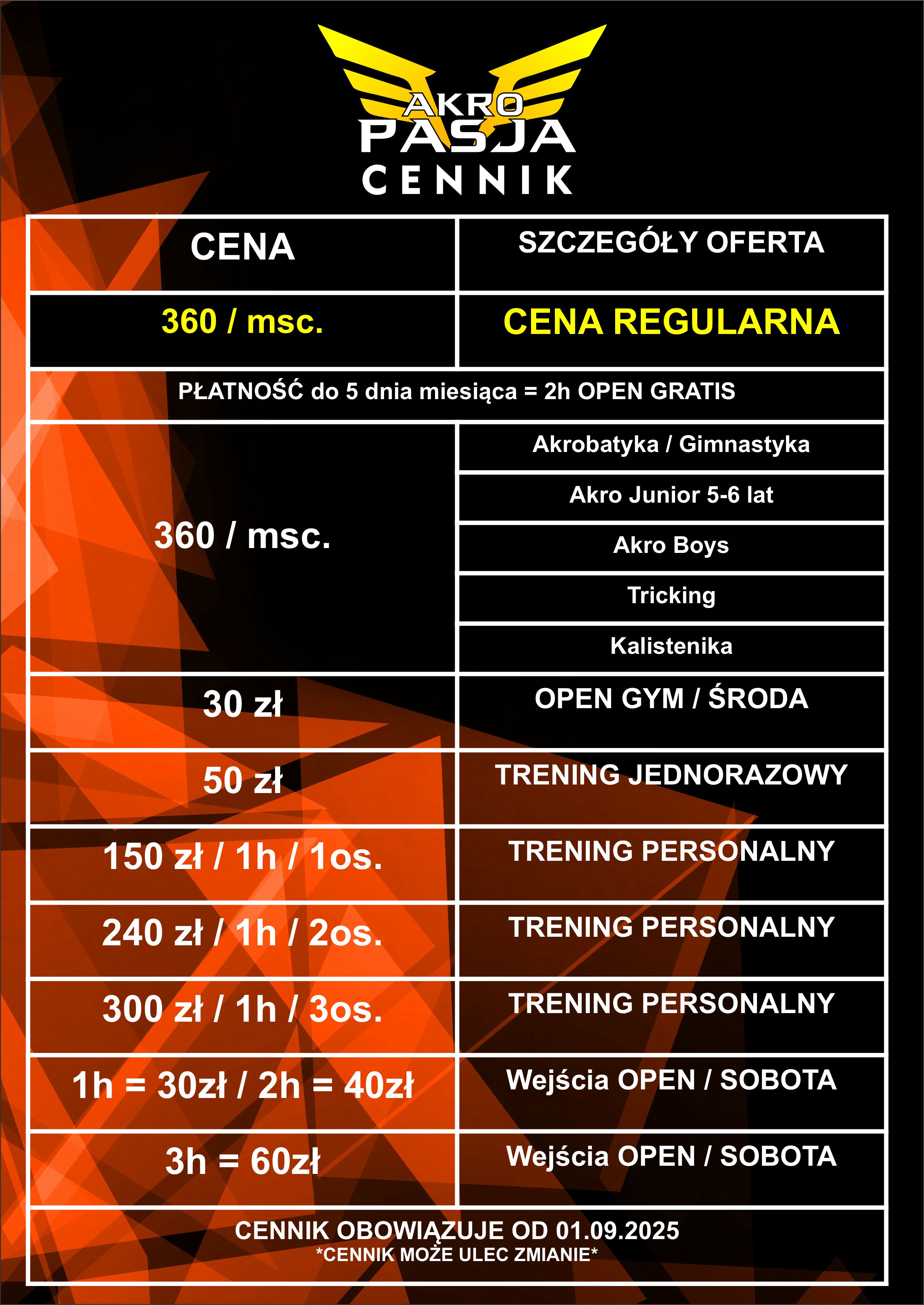 Cennik zajęć AKRO-PASJA 2025-2026